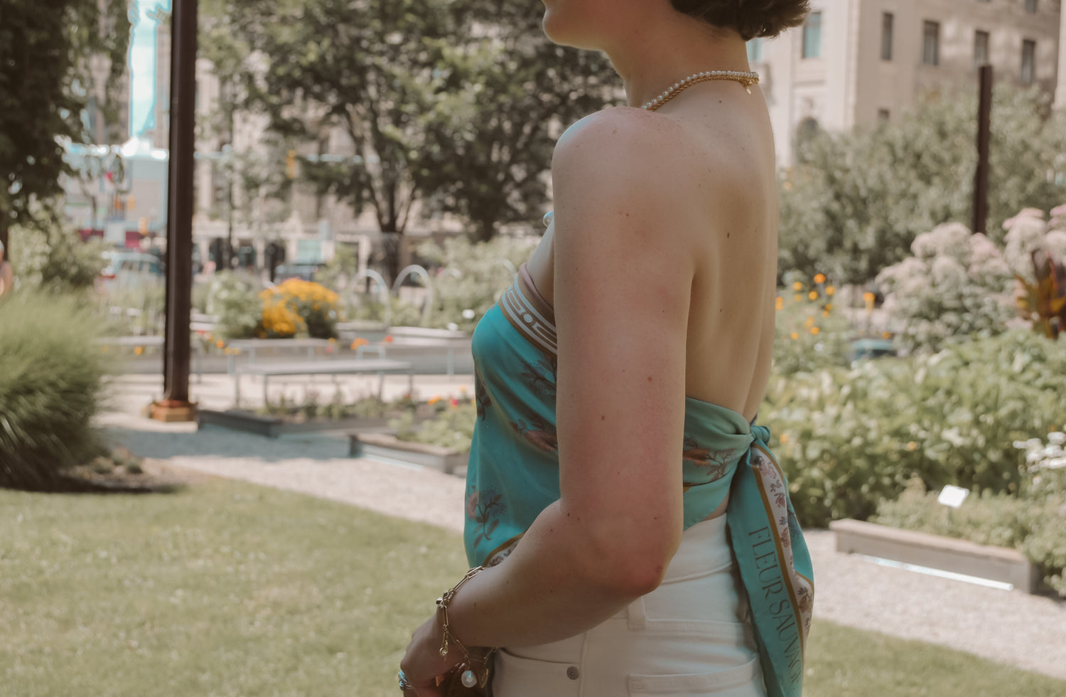 Maria has created a collection of sustainable heirloom luxury silk scarves to raise awareness for breast cancer.